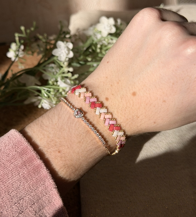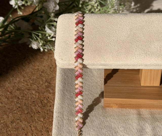 Bracelet tissé à la main. Les perles que j’utilise pour réaliser ces bracelets sont des perles Tila Miyuki . Les perles Miyuki sont des perles en verre. Le mousqueton et la chaîne d'extension sont en acier inoxydable.